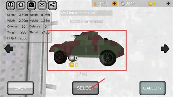 在车辆模板选择界面,查看【My-First-Armored-Car】的参数,确认无误后点击【SELECT】按钮,就能选用这款装甲车辆了。