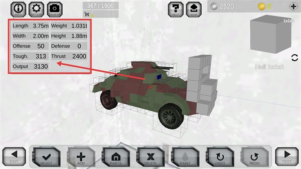 在编辑车辆时,注意观察左侧【Offense-50】这类参数的变动情况,调整部件后要对车辆属性进行确认,保证其满足作战方面的需求。