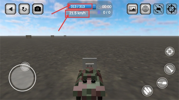 进入测试驾驶界面后,留意顶部显示的【313/313】状态信息和【21.5-km/h】的速度数值,借助左侧的摇杆来操控车辆行进。