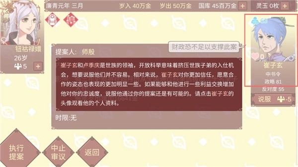 12、针对世族领袖崔子玄与卢季庆,需通过利益交换的方式提升其忠诚度,以推动提案获得通过。