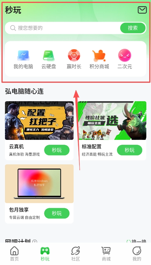 使用这款软件操作十分便捷,主界面上清晰展示着各类游戏以及云电脑的配置选项,你只需浏览查找,然后点击自己感兴趣的条目下方的“秒玩”按钮就能开始使用了。