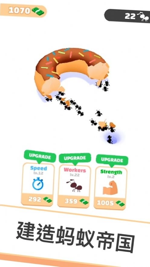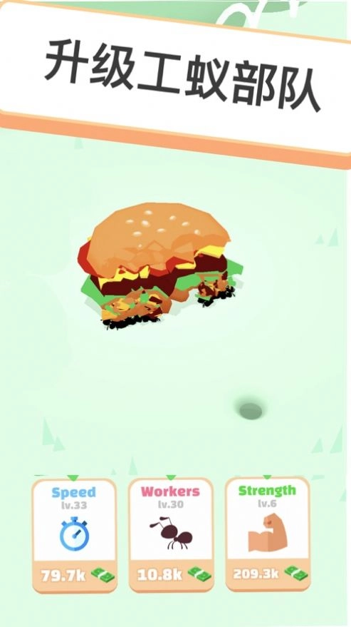 1、升级和发展你的蚁群,能够更高的来进行速度的提升,建造强大的蚂蚁帝国;