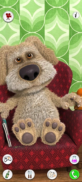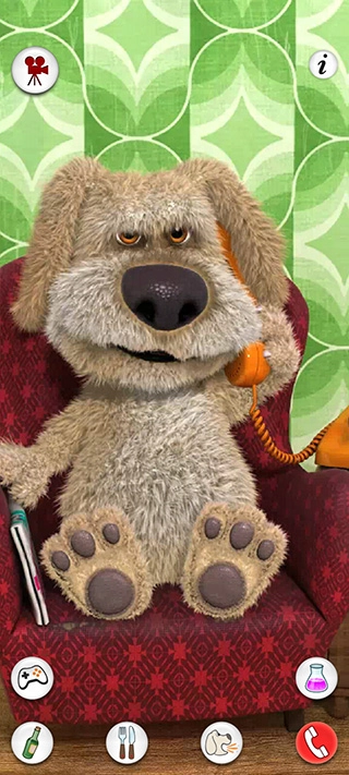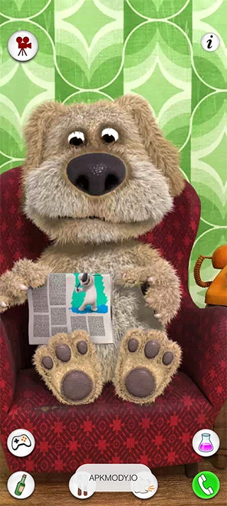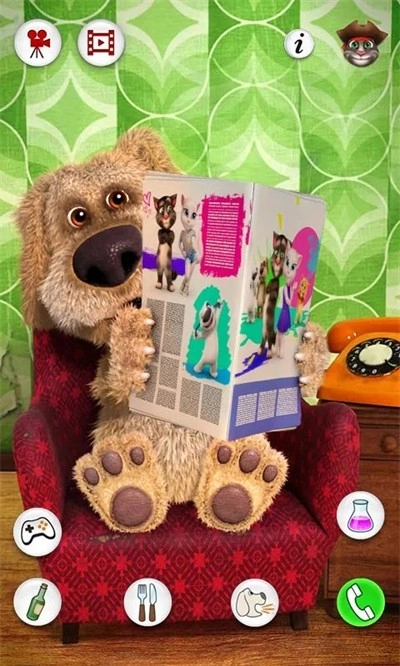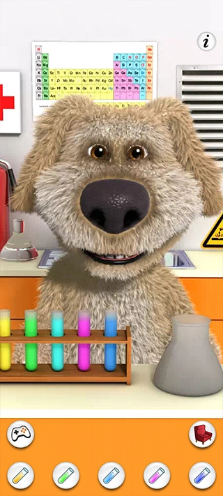 :你可以带本去实验室做化学实验,通过混合不同的试管观察化学反应,您可以录制与此互动的视频。打开会说话的狗狗本应用后,用手指点一下本正在看的报纸,他就会把报纸合起来。之后你就能和本聊天了,他会重复你说的话。