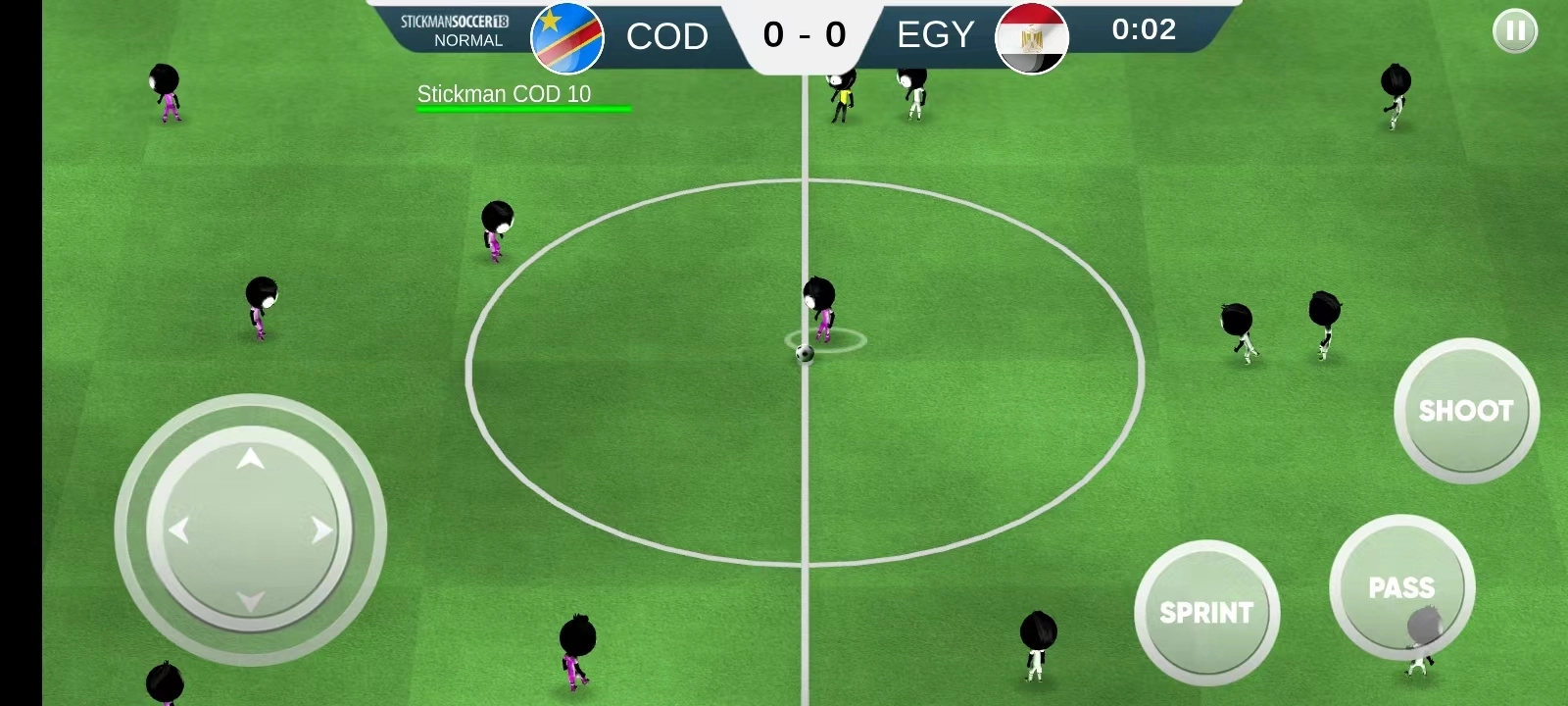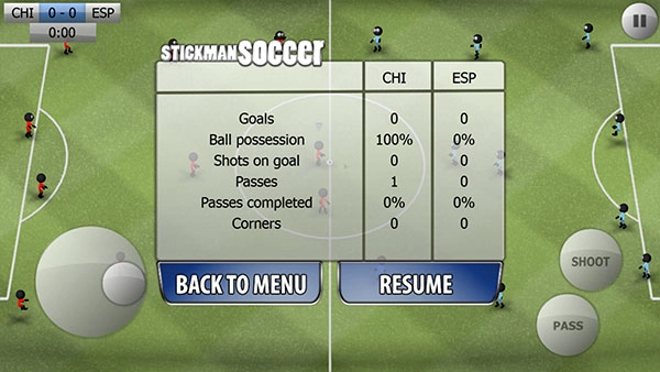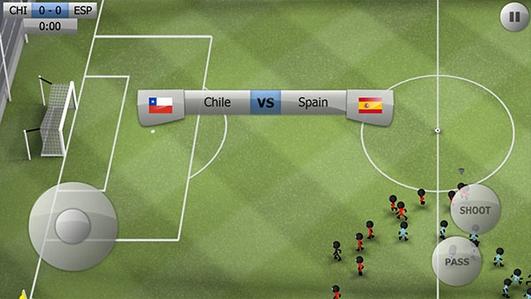 接下来会开启培训环节,左侧的虚拟按键用于操控角色的移动方向,右侧的虚拟按键则分别对应传球、射门和进攻功能。玩家需要操控火柴人完成带球过人的动作,只要把球踢进对方的足球球门就算得分。