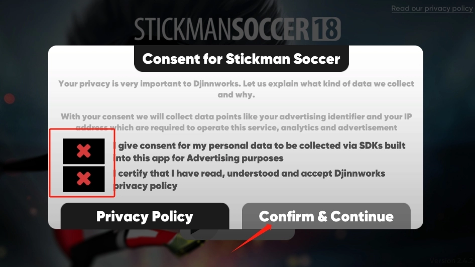 :其中的所有角色形象都是采用的火柴人形象设计,可以给玩家带来轻松愉快的感受,感受与众不同足球竞技挑战。首先,玩家在本站下载并安装好游戏后,打开进入游戏界面,先点击下图所示的这两个位置,接着再点击【confirm&continue】按钮。