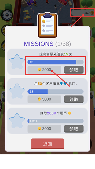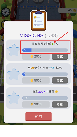 查看【MISSIONS-(1/38)】界面,优先推进“提高售票处速度15次”任务,当前进度为3,完成后可领取2000笑脸奖励。