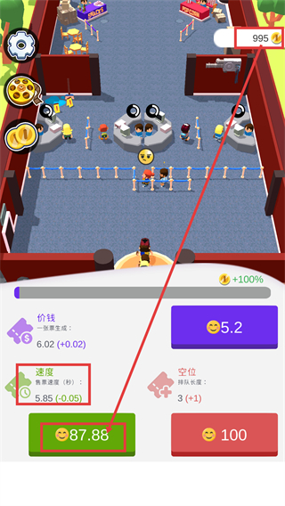 消耗【87.88】笑脸提升【售票速度-(5.85-0.05)】,同时将排队空位扩展至【3-(+1)】,从而提升票务处理效率。