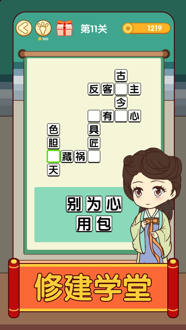 2、根据游戏给出的提示,填入成语,完成所有成语填空即可通关。