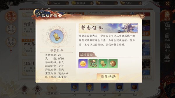 玩法入口:活动-帮会任务-前往活动