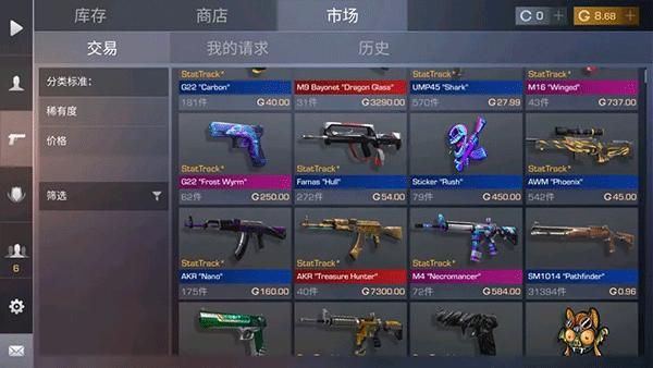 市场是供玩家之间相互交易各自皮肤的平台,游戏皮肤的等级依次为白、浅蓝、深蓝、紫、粉、红,通常颜色越深,对应的价格也就越高。