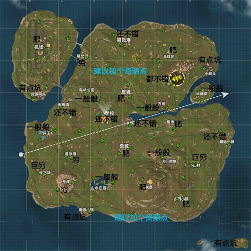 萌新确实挺单纯的,总爱往大资源点跑结果送人头,咱们可不能跟着犯傻。选落点得先看航线——要是航线经过好几个大资源点,不如挑个偏远的大资源点或者野区,说不定能捡到好装备呢~不过也得注意,如果这局大家都比较谨慎,那偏远地方搞不好也会爆发激烈战斗。想刚枪的话,可以跳自己熟悉的大资源点找宝箱;想苟着发育,就选边缘区域待着。那些中间有大路穿过的地方,其实是个不错的选择(如图↓)。