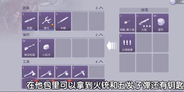 击败黄三炮之后,我们就能从他身上获取火铳、五发子弹和钥匙了。