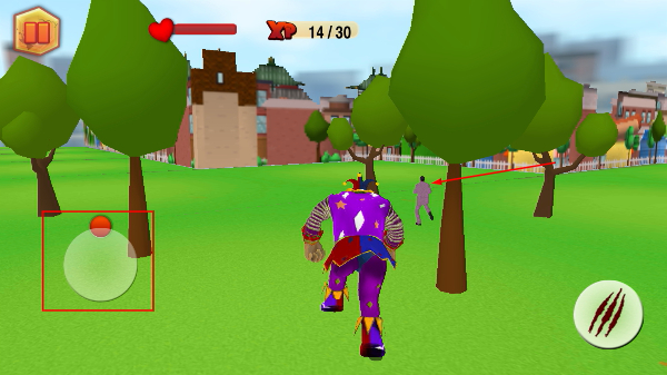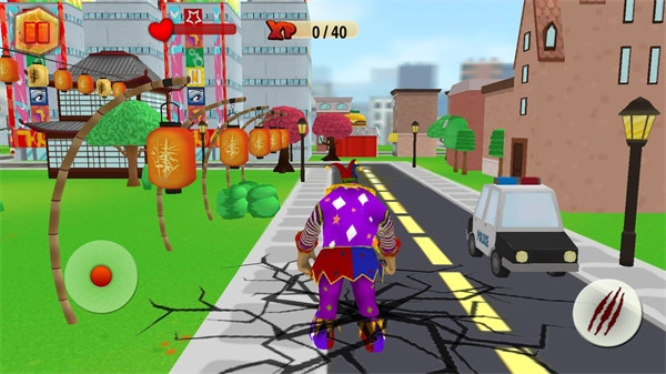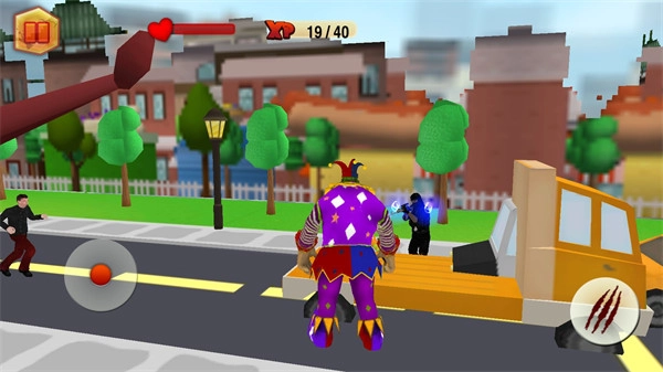 你可以通过左侧的虚拟摇杆来控制小丑的移动,在追逐市民的过程中积累经验,同时要灵活应对随时可能出现的警察追捕。