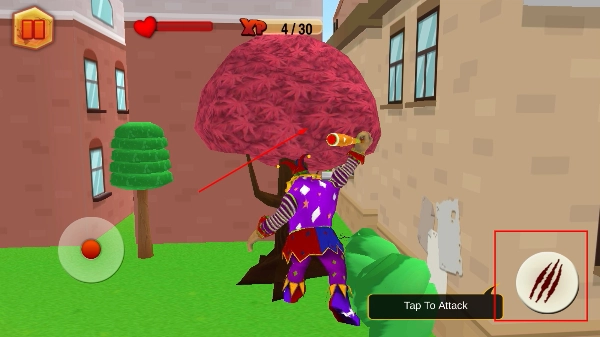可以点击右侧的【TapToAttack】按钮来攻击树木之类的物体,以此积累经验值,进而提高小丑的破坏力与等级。