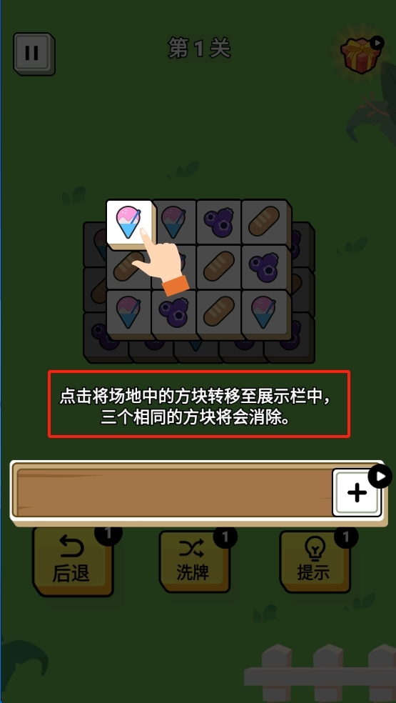 基础操作指南:点击选中场上方块,再点击底部空槽即可放入,集满3个相同图案自动消除。