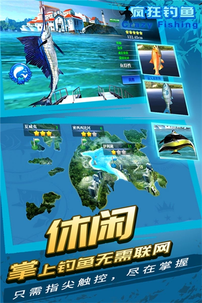 疯狂钓鱼是一款在手机上模拟钓鱼的游戏,你可以不用出门就能在各地钓鱼,从长江的湍急水流到黄金海岸的碧波,有23个实景渔场都可以钓。疯狂钓鱼里有多种真实鱼类,小到河鲈大到青枪鱼,咬钩时鱼线还有紧绷的滋滋声,点击手机屏幕抛竿,鱼咬钩后按住屏幕和大鱼拔河就能钓上来。