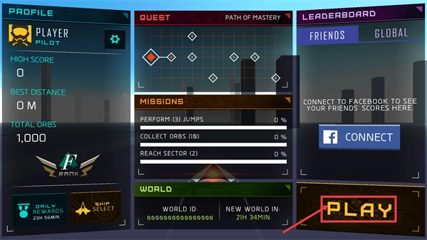 在游戏主界面点击【PLAY】按钮即可进入游戏,与此同时,你可以查看【MISSIONS】板块里的任务(例如完成3次跳跃),游戏初始会为你提供【1000-TOTAL-ORBS】。