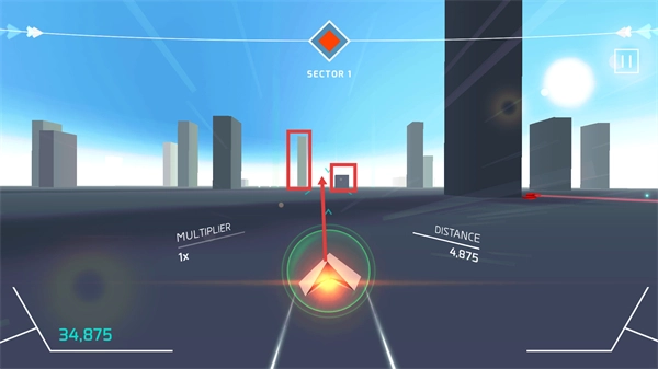 在【SECTOR-1】关卡里,玩家需要操控载具避开障碍物并收集各类道具,目前【DISTANCE】数值为4875,请留意跟随箭头的指引进行移动。