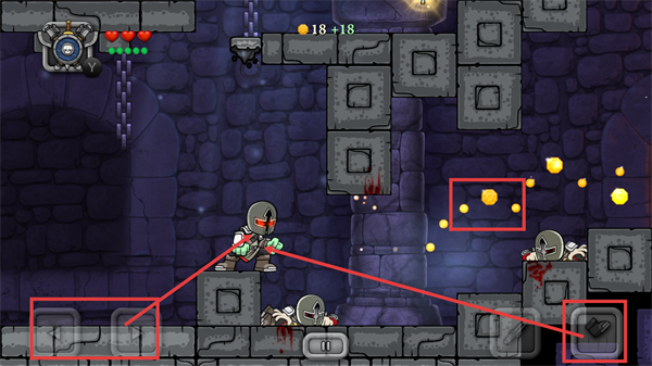 进入关卡后,通过操控移动按钮来控制角色行动,收集场景里的金币,与此同时利用攻击道具击败敌人以积累分数。