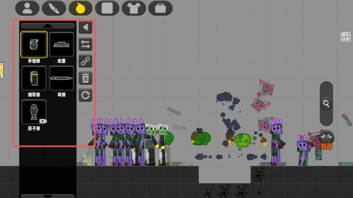 4、使用武器道具点击界面上方的炸弹图标,可以选择「手榴弹」等武器道具,对感染体造成范围伤害,在关键时刻快速清理敌人。