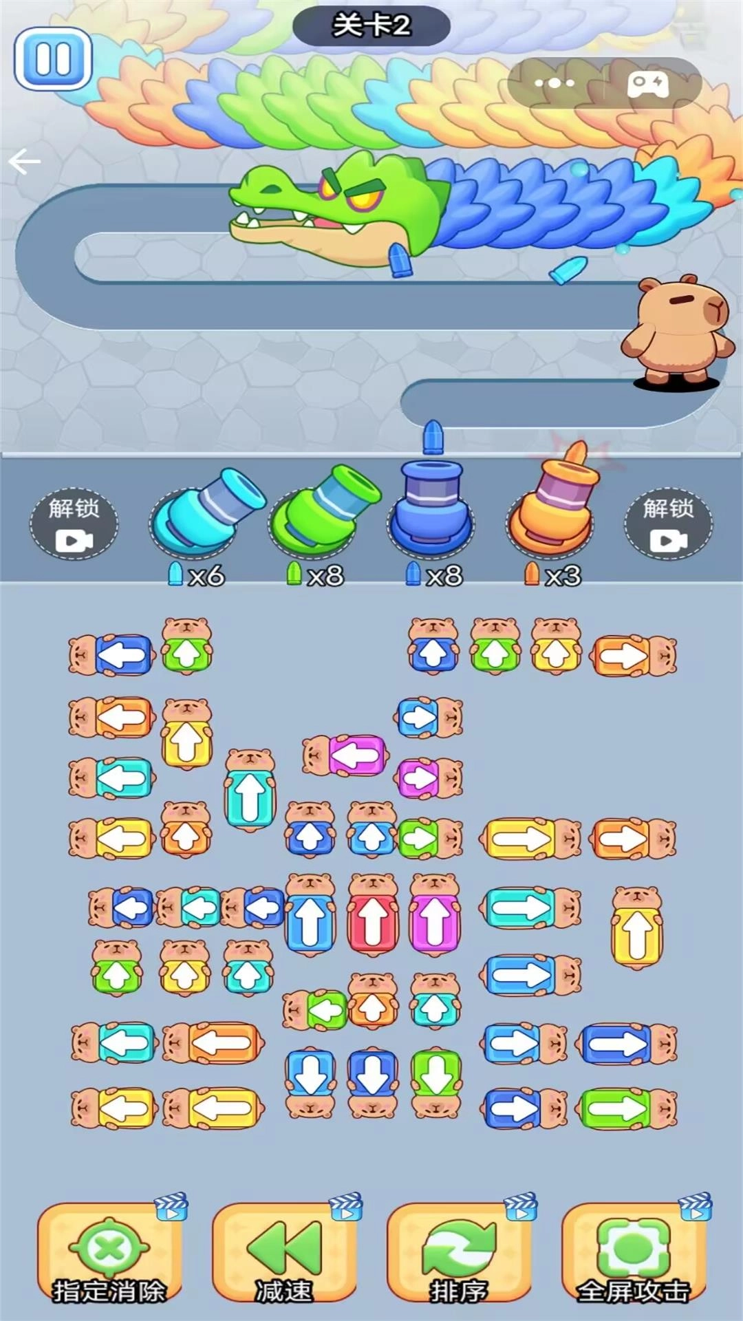 点击带有箭头标识的卡皮巴拉车辆,让它从静止状态启动行驶,到达指定位置后会自动变形为炮台。