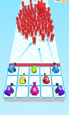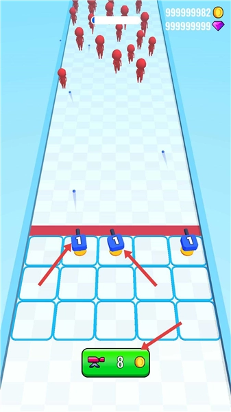 2、进入游戏后,下方会出现带有数字标识的装置,上方则有红色小人。你需要借助这些装置,在收集金币的同时推动游戏进展,过程中要留意避开可能出现的障碍。
