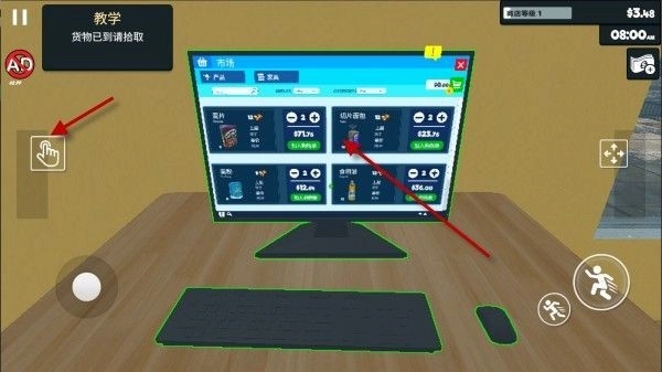 1、打开游戏后可以跟着左上角的教学一起,首先到超市内的电脑上进行网上订货。