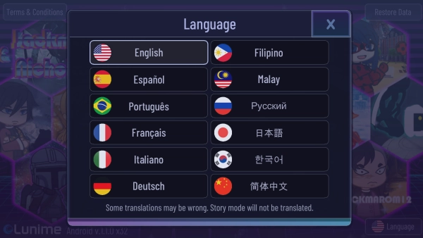 1、打开加查鬼灭之刃模组手机版,点击右下角Language。