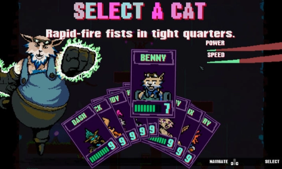 2.角色选择:九只猫咪角色可供挑选,每只都配备专属武器与必杀技,远程、近战类型任你选择