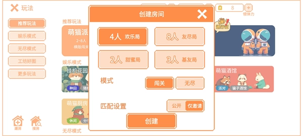 3、按照需求挑选房间可容纳的人数(例如2人的甜蜜局、4人的欢乐局之类),接着选定游戏模式(闯关或者无尽),与此同时把房间类型设置成「公开」或者「仅邀请」,确认无误后点击「创建」按钮。