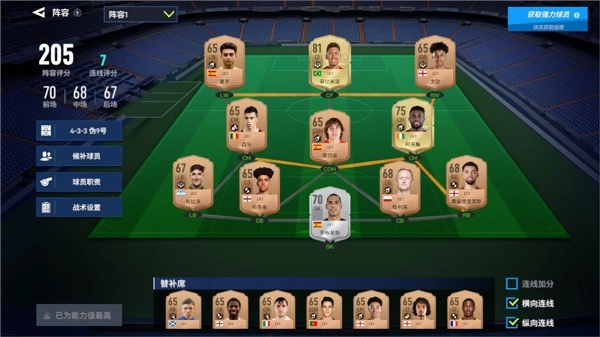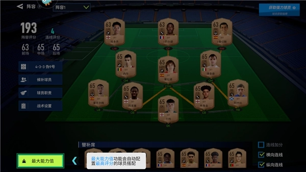4、如果想要改的话变阵容搭配的话,点击最大能力值,它会自动配置最高的球员搭配;
