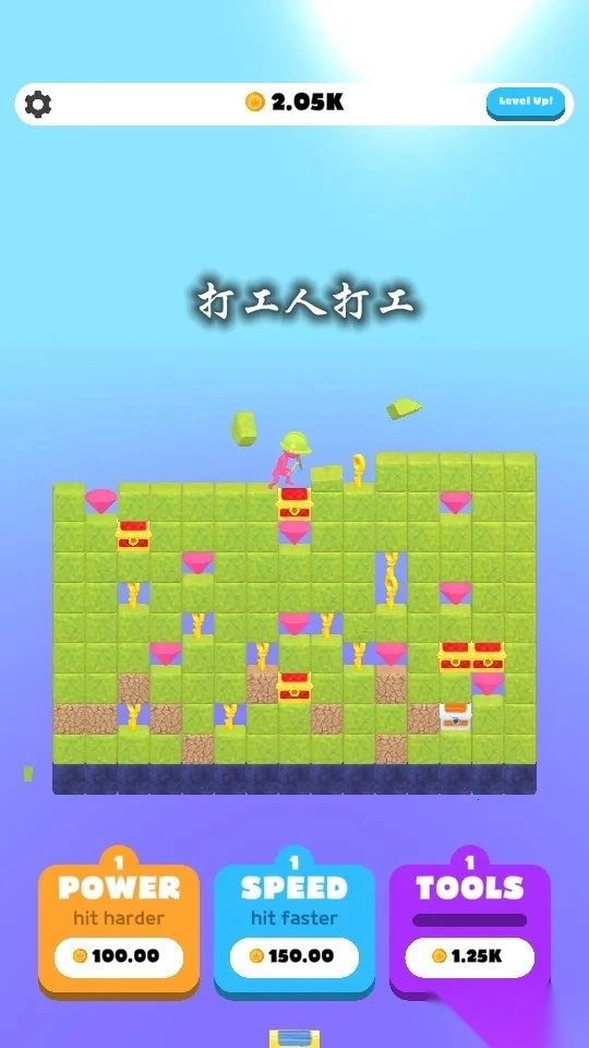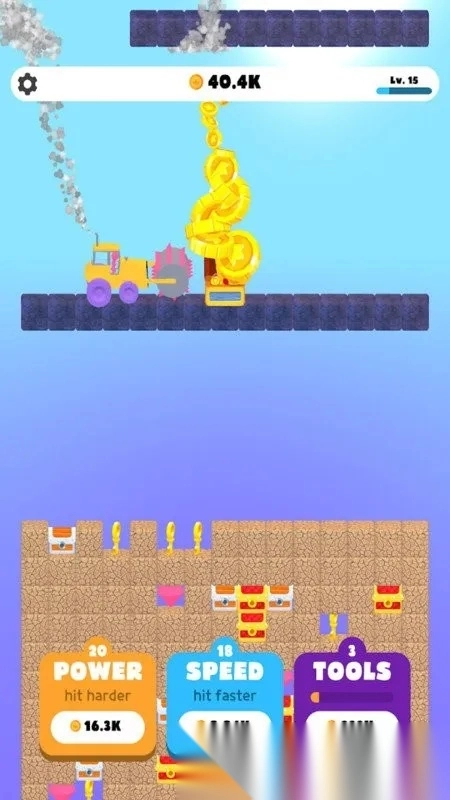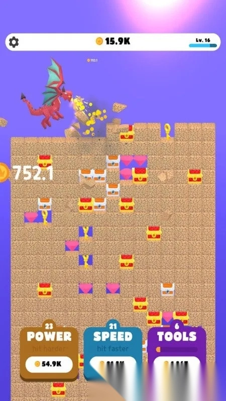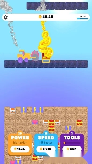 2. 游戏玩法丰富多样,从镐头推土机到巨龙与飞行器,多种工具助你深入地球核心。升级装备能有效提升工作速度,还有许多宝箱等你开启,惊喜不断。