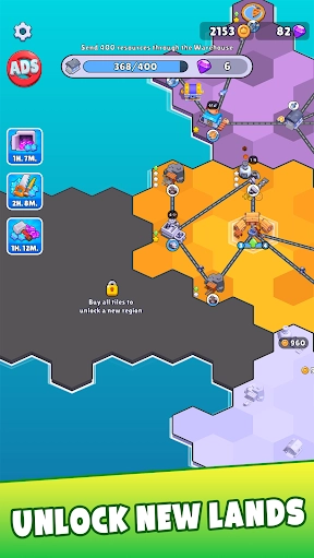 ,由国外知名游戏厂商SayGames Ltd发行的一款建造经营类。游戏核心是围绕供应链展开,我们将会开垦冰原,解锁森林、木材厂等建筑,通过伐木、采矿、制作和加工原材的流水线作业来获得源源不断的收益,从而帮助你去开辟更多区域,不断扩展自己的规模,解锁更多大陆!除此之外,还需要及时升级设施提高利润,让生产能够跟上建设,打造属于你的帝国!