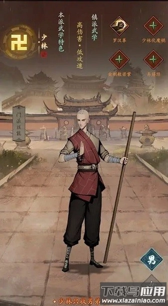 少林武功素以大开大合闻名,招式刚猛绝伦;尽管攻击速度稍缓,可单次伤害极强,堪称江湖上刚猛流派的典范。