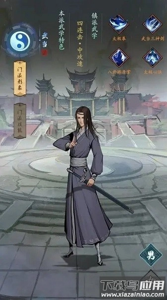 武当为内家拳法之宗,道法精深剑术超群,讲究阴阳平衡与道法自然,攻防一体;因此在六大门派中属性较为均衡,风格飘逸灵动。