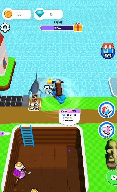 进入游戏的初始挖矿区,向下挖掘,获取各种矿产。