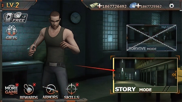 然后一次就是一个剧情模式以及生存模式,剧情模式就是过任务,赚钱购买装备,然后解锁下一个任务,直到逃出监狱。这里达菲鸡要重点说明一下,游戏整体来说剧情还是很不错的,唯一的嘈点就是这里的剧情达菲鸡还以为是那种3D动漫类型的剧情模式,可惜的是游戏是那种普普通通的对话框,这一点相对于大型3D游戏例如:《侠盗飞车之罪恶都市》之类的大型3D游戏来说还是比较可惜的,但是仔细想想如果这里面有那种剧情模式的话估计要腾出很多内存来了,而且这款游戏模式单调,这样一来就会损失很多的玩家。
