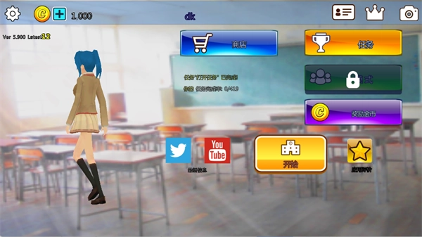 3、进入主界面后,可通过【商店】购买道具,在【任务】中查看当前目标,点击【开始】即可进入校园场景。