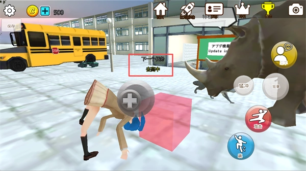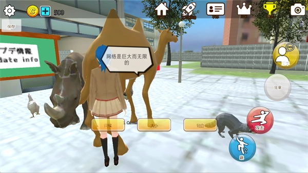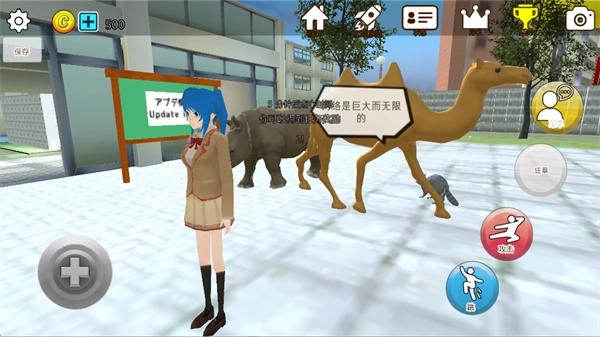 4、进入校园后可自由探索并与动物互动,右侧设有【攻击】【跳跃】等基础操作按钮,同时会触发相应的剧情提示。