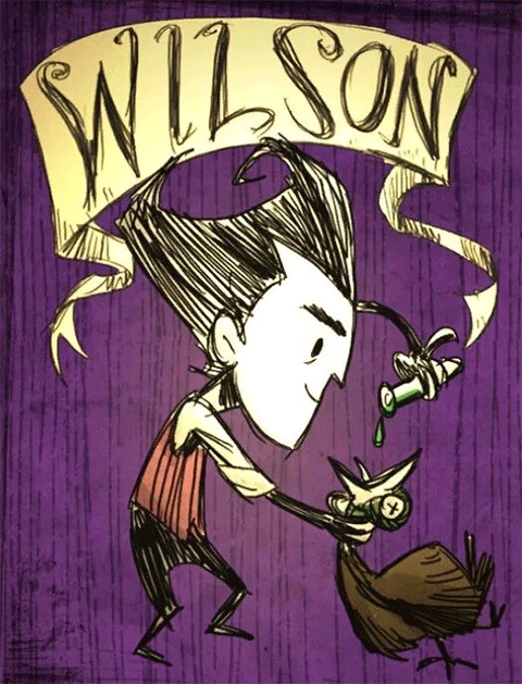 威尔逊是玩家可以使用的第一个初始角色,设定是科学家,被恶魔传送到异世界使用的传送门,其实也是威尔逊在恶魔的指导下完成的。威尔逊的胡子会越长越长,而胡子除了冬季的保暖作用以外,还可以剃下来作为复活肉像的主要材料之一,同时剃完胡子后也会回复 SAN 值,算是比较实用了。