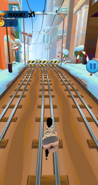 根据赛道的起伏变化以及障碍所在的位置,控制好按键的时长来完成短距离跳跃或长距离跳跃,以此避免从赛道掉落,同时尽可能收集把子肉。