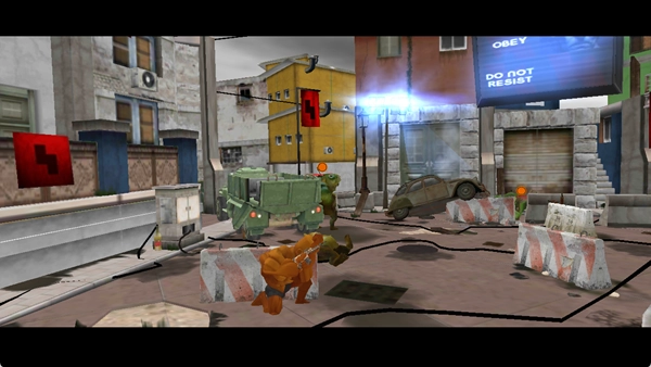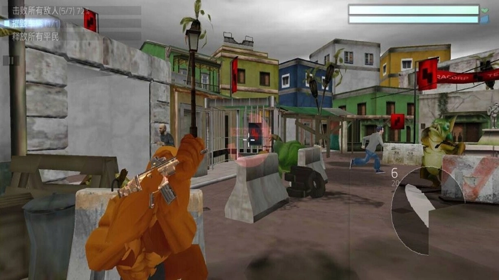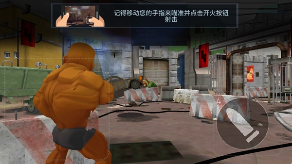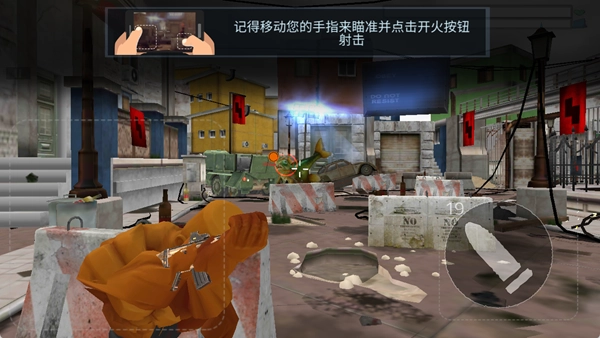 按照提示,移动手指进行瞄准,点击即可开火射击,要借助场景里的石墩、车辆等掩体来躲避敌人的攻击。