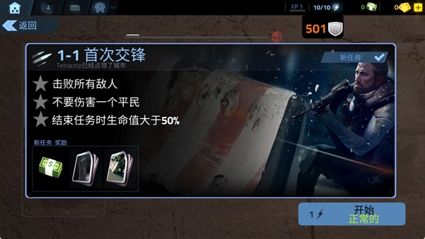 进入游戏后,选择“1-1首次交锋”这类任务,查看任务目标和对应的奖励,然后点击开始按钮。