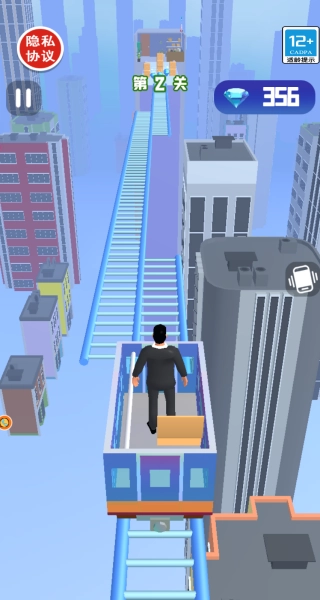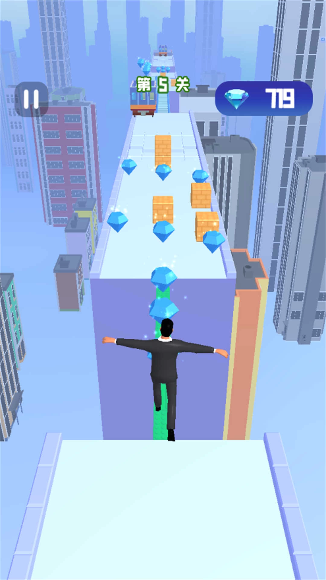 在跑酷游戏里,玩家控制角色收集砖块,依据路面的破损状况投放砖块来修补路面,从而加快下班的进度。