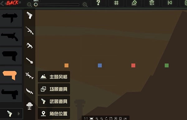 3、点击之后。我们就可以创建地图了,点击左下方左后一个图标,我们就可以切换主题、场景、武器、和角色的选项,我们长按自己地图上面的物品可以拖动物品的摆放位置。