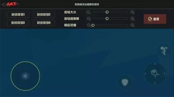 12、自定义布局中可以设置四个基本功能键的按钮大小,按钮透明度以及响应范围,系统提供4种排列方案,我们可以保存4种常用的不同排列方案,以便之后快速切换。