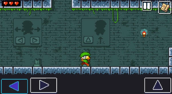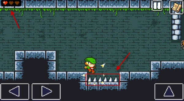 2、简单玩法:先了解游戏里面的简单玩法吧,玩家可以看到点击屏幕上面的那个左右的按钮就可以控制自己的人物进行左右的移动了。点击右边的向上的按钮就可以进行跳跃了,操作就是这样的经典简单;