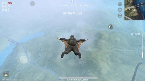 游戏中跳伞前用的是翼装,也叫做飞鼠装。这种装备的好处就在于飞行速度非常快。在下降的使用玩家将方向键向前滑动,可以最大限度增加下降速度(翼装最大速度为165KM/h),让你更快的到达强制开伞点。
