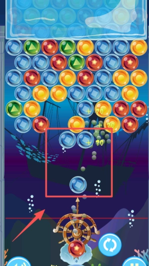 进入海底射击界面后,你需要操控船舵样式的发射器,瞄准并发射蓝色泡泡。要精准命中相同颜色的泡泡群来完成消除,与此同时,还要留意避开场景里的沉船障碍物和正在游动的鲨鱼。