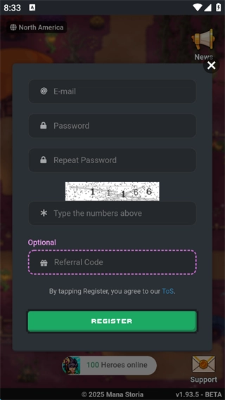 2、依次输入,邮箱号,密码,再次输入密码,随后填入验证码,推荐码可填可不填,随后点击“REGISTER”,就可以直接进入游戏了。